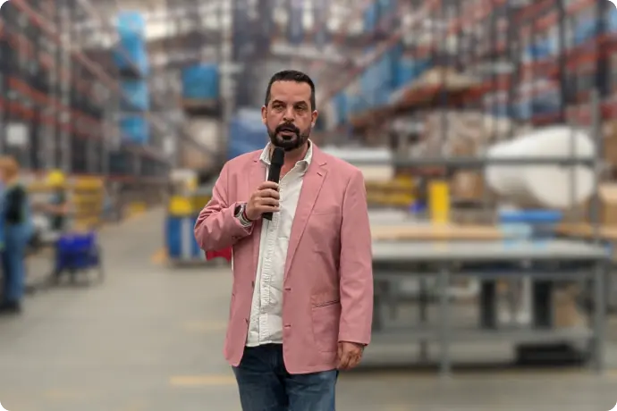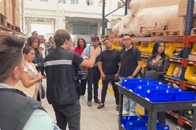 Guillermo Duarte, Director de Fulfillment, guiando a los invitados en un recorrido por el almacén.
